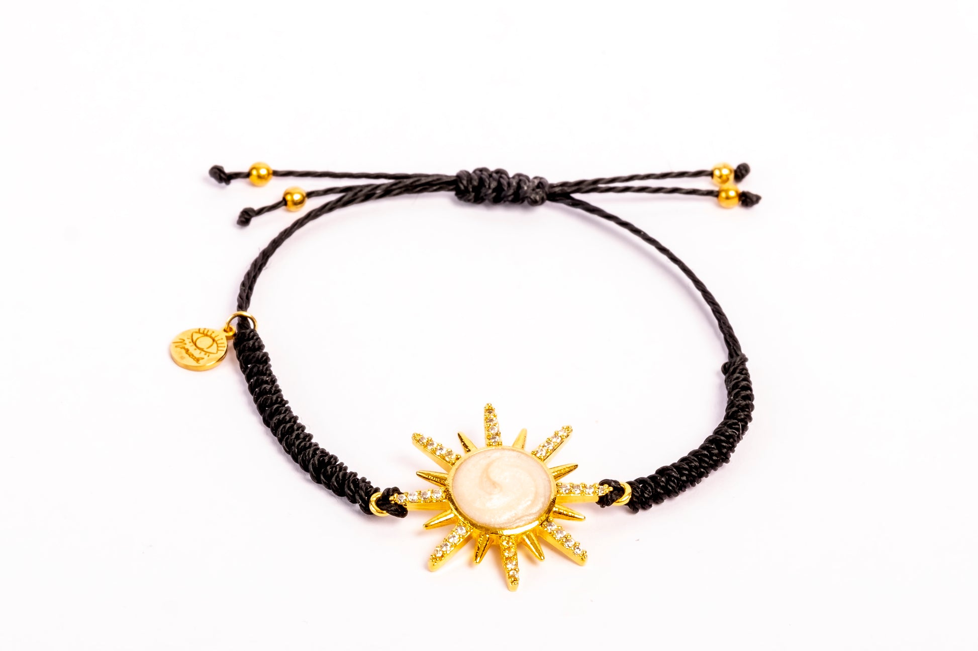 Esta pulsera es ideal para quienes buscan un accesorio versátil y elegante que complemente tanto looks casuales como formales. La combinación del hilo trenzado con el brillo del colgante la convierte en una pieza imprescindible en tu colección de joyas. ¡Luce el sol en tu muñeca y destaca con estilo!