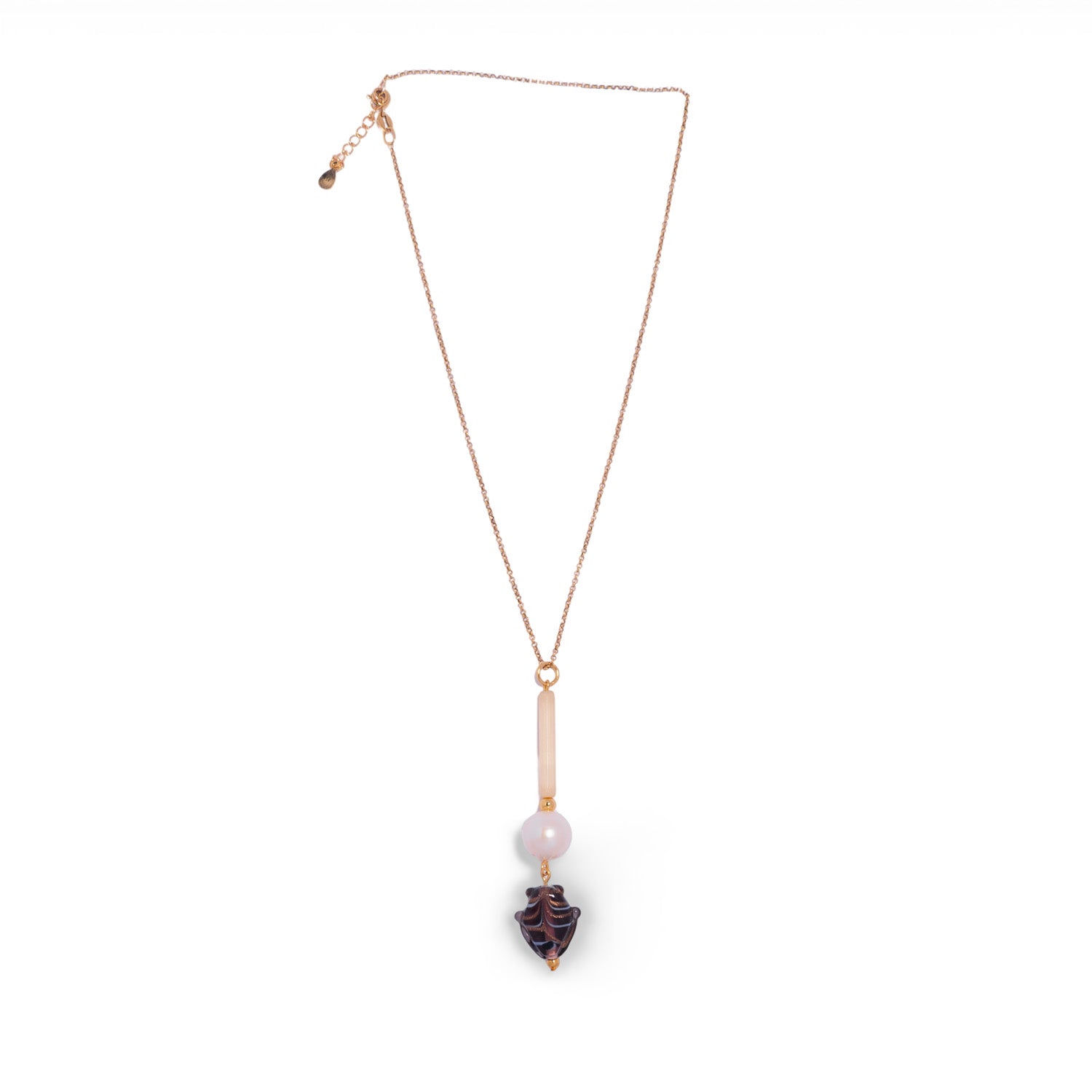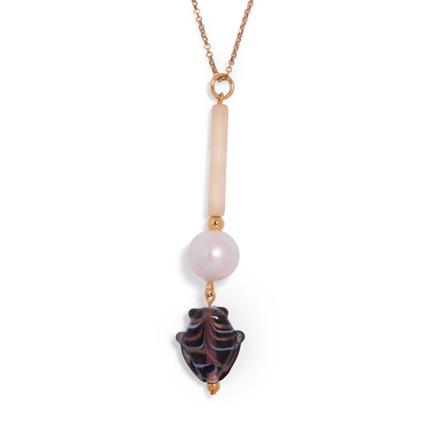 Elegantes collar Fruit de Mer hechos a mano, combinan la exquisita artesanía de cristal de Murano con piedras naturales y perlas auténticas. Cada pieza está montada en cadena de plata bañada en oro de 18k, y un acabado sofisticado. Diseño exclusivo que aporta un toque de distinción mediterránea a cualquier conjunto.