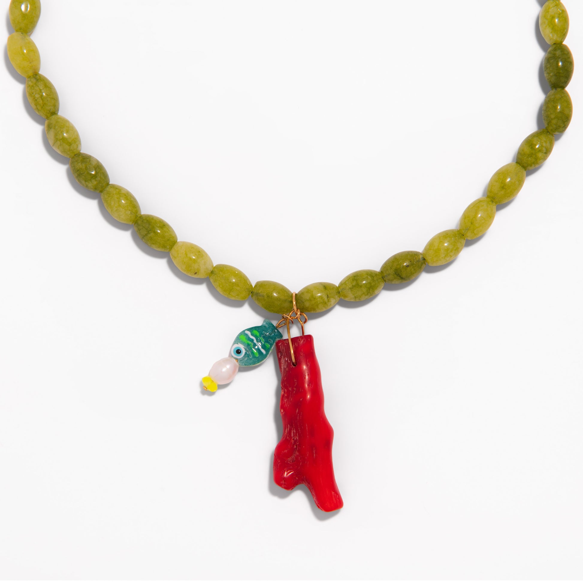 Collar artesano con piedras naturales verdes que evocan la calma de las aguas tranquilas mientras el colgante de pez en cristal acompañado de un toque de coral rojo, aporta vitalidad, fuerza y un contraste lleno de vida.