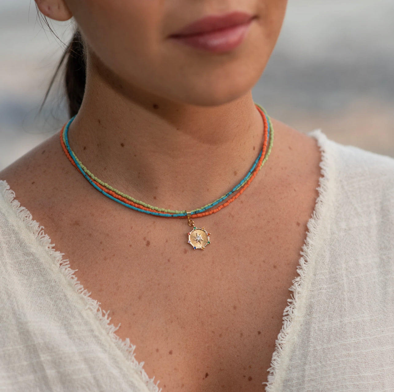 Collar Soleil es un collar con diseño moderno y único. Tiene un charm de sol y circonitas de diferentes colores que le dan un toque refrescante y lúdico. Además, incorpora cuentas afganas para un acabado suave y refinado. Una joya perfecta para lucir en tu día a día.