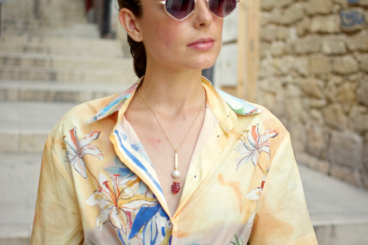 Elegantes collares Fruits de Mer hechos a mano, combinan la exquisita artesanía de cristal de Murano con piedras naturales y perlas auténticas. Cada pieza está montada en cadena de plata bañada en oro de 18k, y un acabado sofisticado. Diseño exclusivo que aporta un toque de distinción mediterránea a cualquier conjunto.