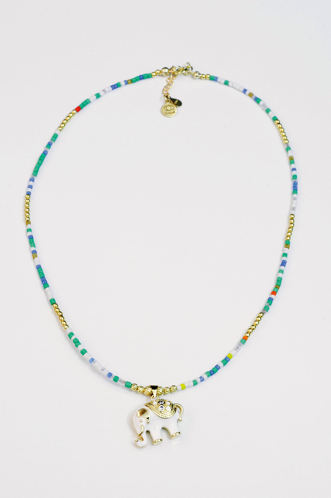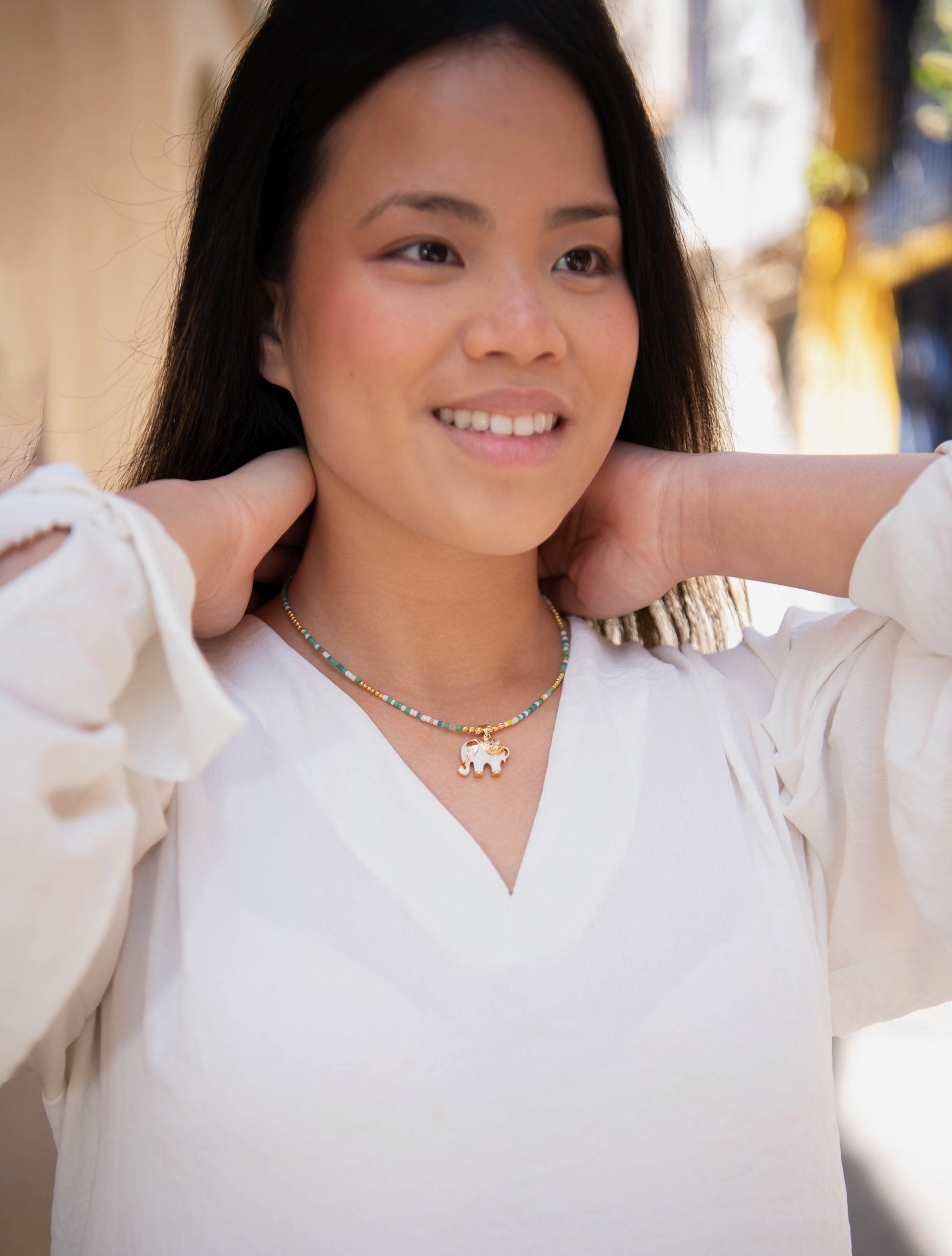 Descripción: Ganesha es el dios hindú con cabeza de elefante de nuevos comienzos que simboliza la sabiduría y el intelecto. Este hermoso collar hecho a mano, que muestra el auspicioso poder talismán del elefante, presenta un charm de elefante suntuosamente combinado con cuentas de plata de ley 925 chapadas en oro de 18kt. El collar se combina con delicadas cuentas afganas de gemas para un toque final decadente. ¡Esta pieza es la máxima declaración boho-chic!