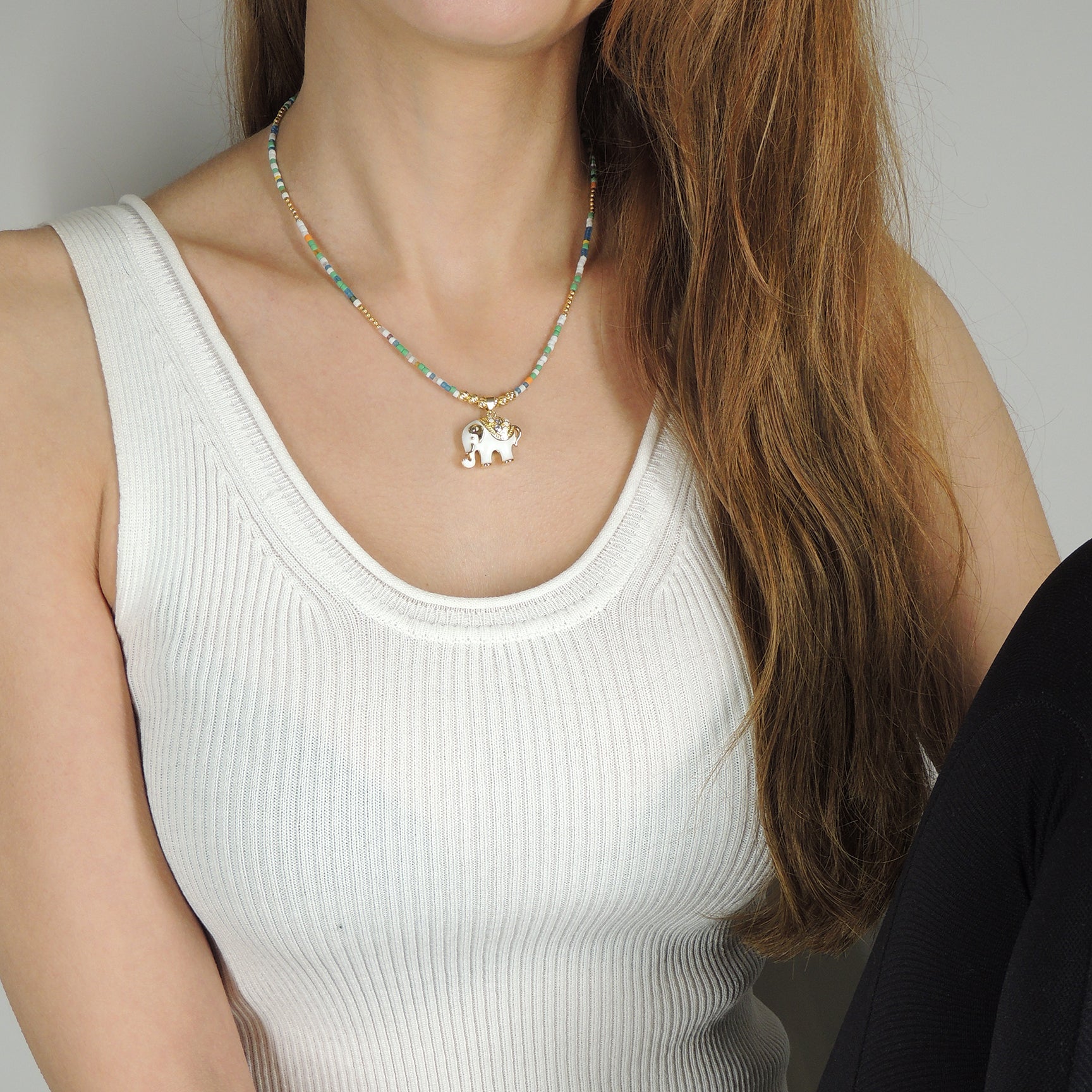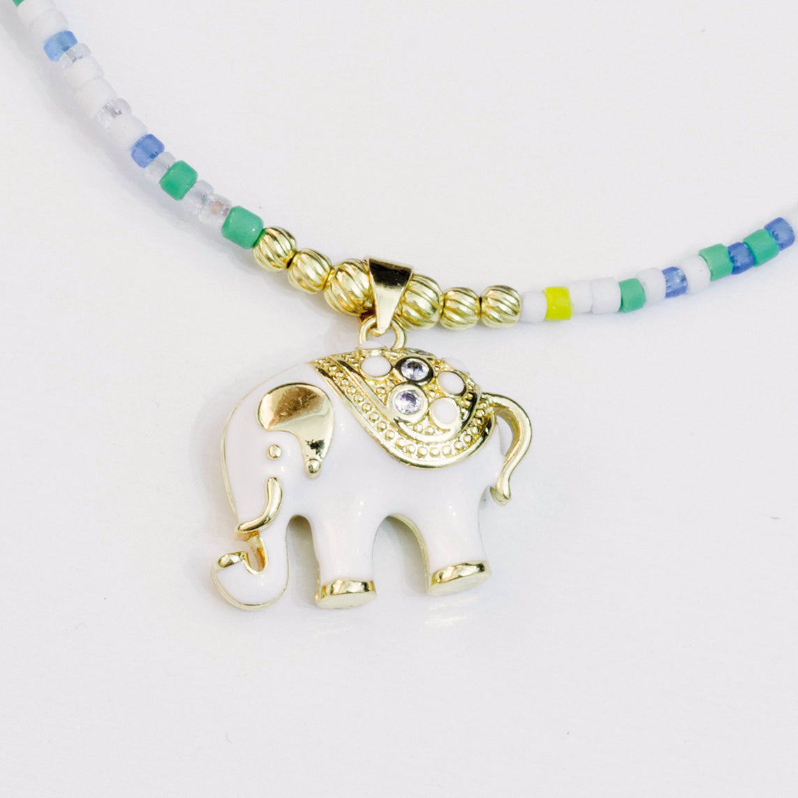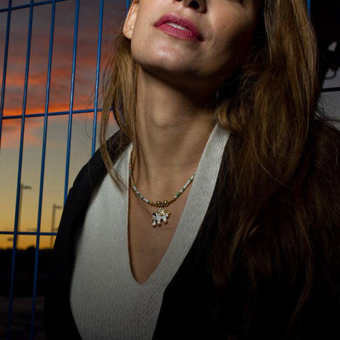 Descripción: Ganesha es el dios hindú con cabeza de elefante de nuevos comienzos que simboliza la sabiduría y el intelecto. Este hermoso collar hecho a mano, que muestra el auspicioso poder talismán del elefante, presenta un charm de elefante suntuosamente combinado con cuentas de plata de ley 925 chapadas en oro de 18kt. El collar se combina con delicadas cuentas afganas de gemas para un toque final decadente. ¡Esta pieza es la máxima declaración boho-chic!