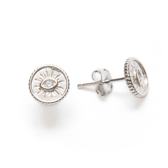 Estos elegantes pendientes de botón en plata presentan un diseño circular con un detalle central de ojo enmarcado por rayos que evocan un aura de misticismo. En el centro del ojo, una brillante circonita añade un toque de luz y sofisticación, convirtiéndolos en una pieza llamativa y distintiva.