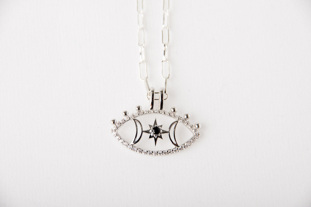 Este collar presenta un delicado colgante en forma de ojo con detalles de media luna y estrella, rodeado de pequeños brillantes que añaden un toque de elegancia y sofisticación. La cadena, hecha de eslabones finos, complementa perfectamente el colgante, creando una pieza armoniosa y equilibrada.