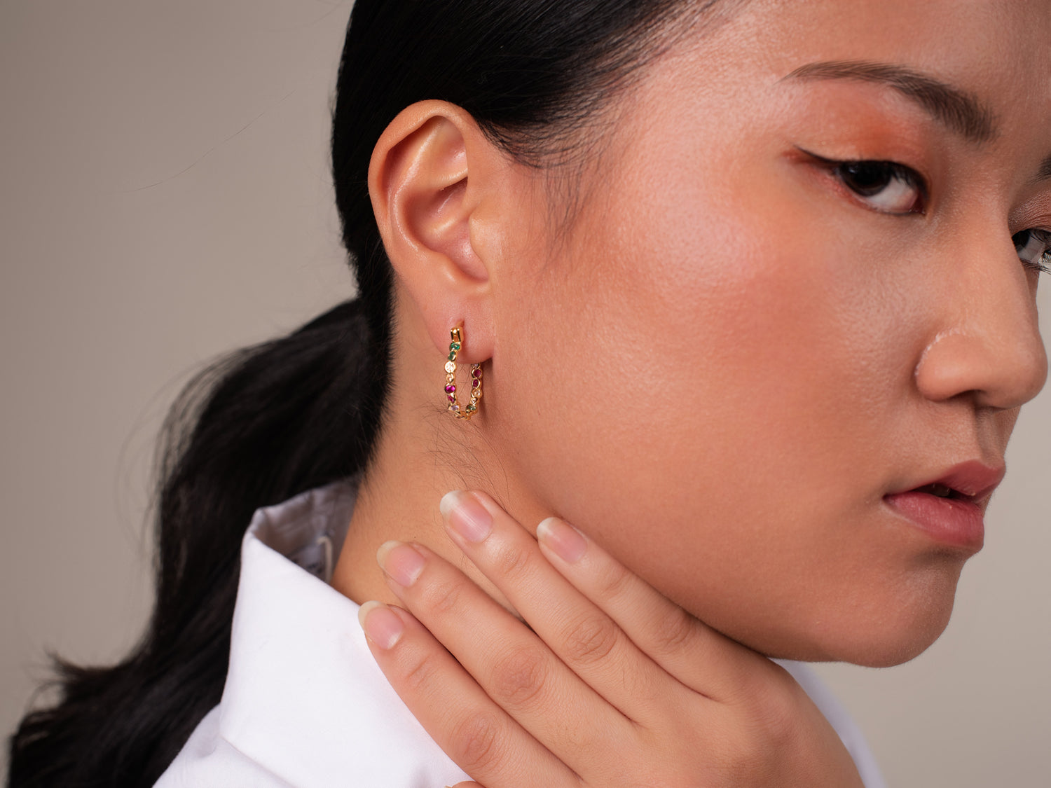 Estos pendientes de aro bañados en PLATA destacan por su colorido deslumbrante. Decorados con piedras multicolores, cada piedra ha sido seleccionada para complementar y resaltar los tonos vibrantes de las demás. Perfectos para añadir un toque de alegría y sofisticación a cualquier atuendo, estos pendientes son ideales para eventos especiales o para dar vida a tu look diario.