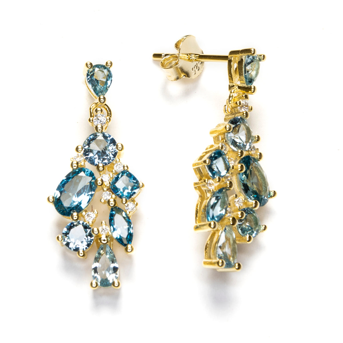 Estos pendientes de plata rodiada están adornados con múltiples circonitas en tono aguamarina, creando un efecto deslumbrante que captura la luz de manera espectacular. Su diseño colgante aporta movimiento y brillo a cada paso, haciéndolos perfectos para ocasiones especiales donde quieras destacar y brillar con elegancia y sofisticación.