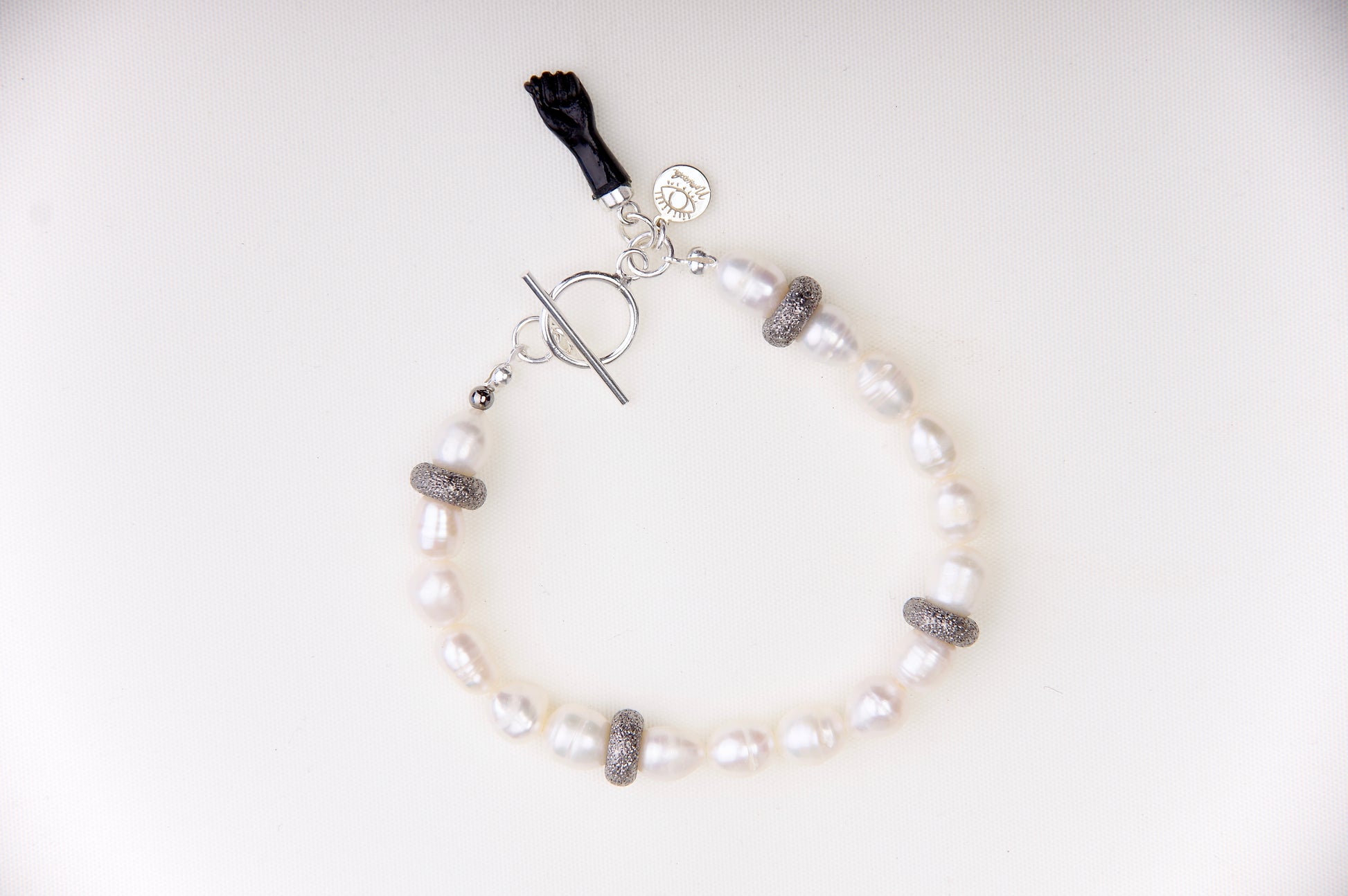 Esta elegantísima pulsera es una combinación perfecta entre perla y plata de ley. Con un exclusivo diseño de rondelle diamantado con baño de rutenio, es un perfecto complemento para cualquier look, además le acompaña el puño de figa que es un auténtico amuleto.
