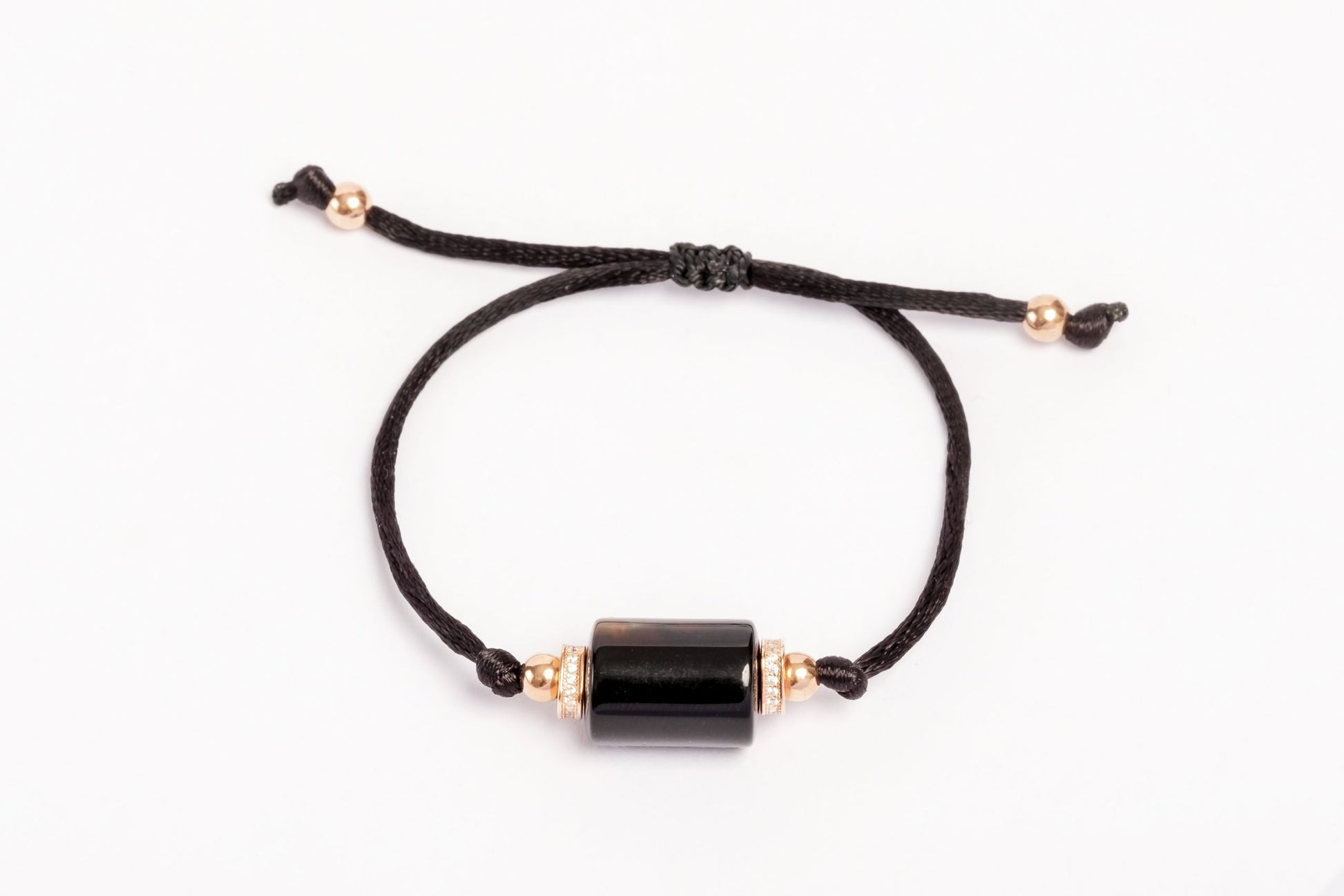 Esta elegante pulsera presenta un diseño contemporáneo que combina un cordón ajustable con un llamativo cilindro de ónix negro. La combinación de estos materiales le da un toque moderno y sofisticado, ideal para complementar cualquier atuendo, ya sea casual o formal.